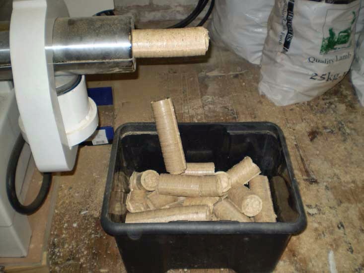 The compacted material is then fed through a large cylindrical tube where the briquettes are cut in to random sizes before being packaged in to handy 10Kg bags.